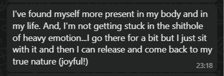 "This was a tailored session, everything was at mine and my body's rhythm with lots of respect, allowance and kindness. I've learned how to go to places in my body where I can feel calmness while other parts are experiencing intensity, this was a revelation for me.